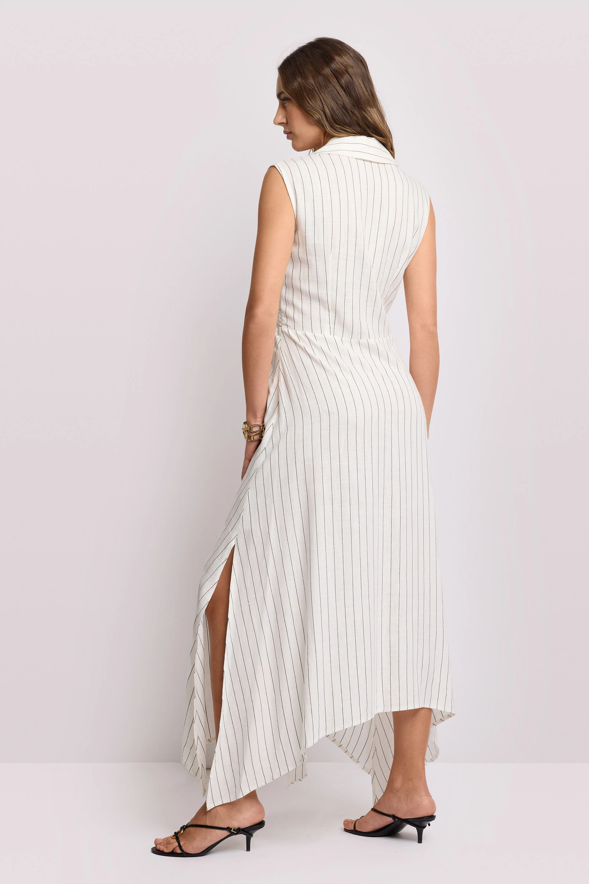 - Abito lungo senza maniche con colletto shirt elegante e stampa a righe verticali