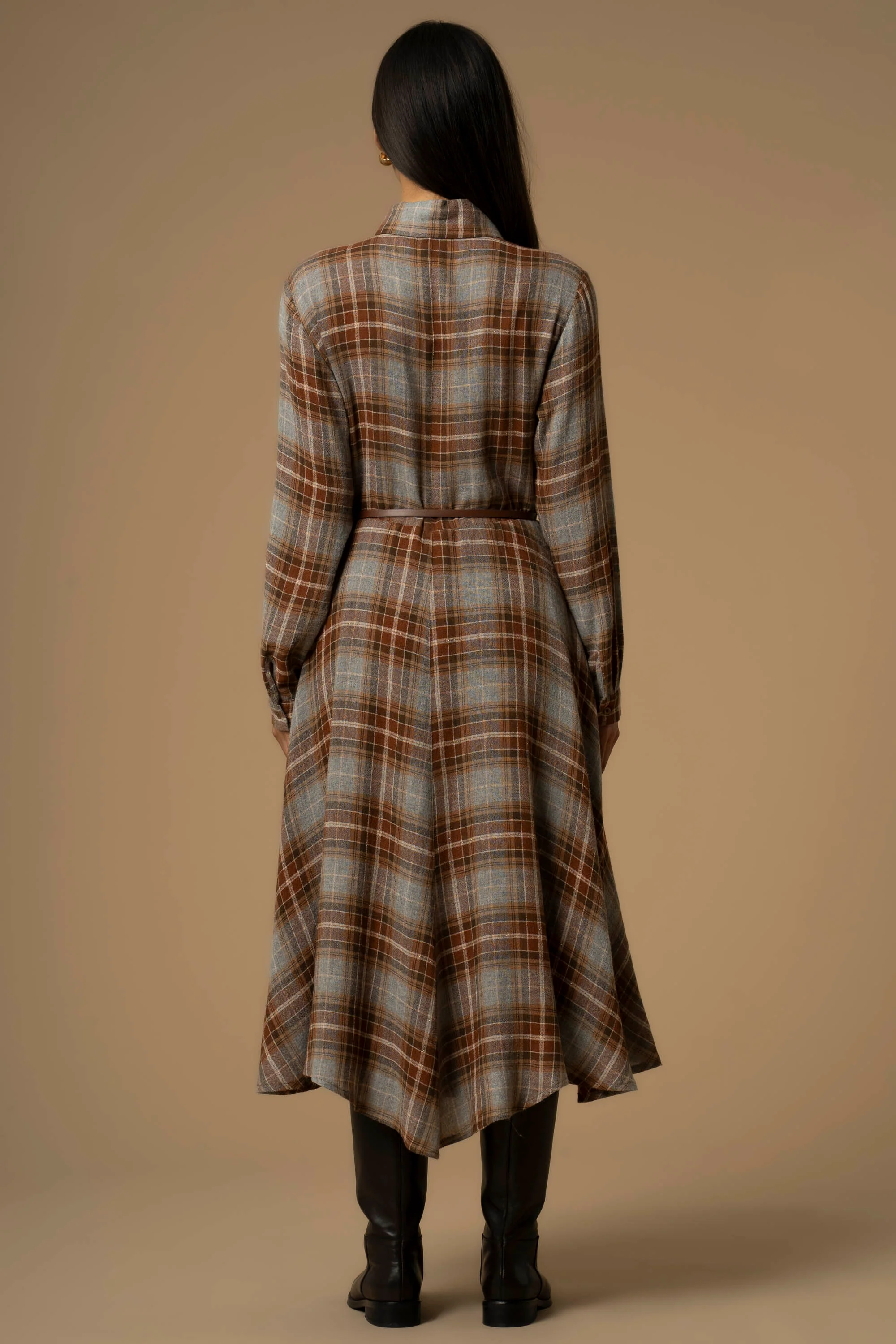 Abito lungo impreziosito dalla fantasia tartan all over. Il capo presenta colletto a camicia, linea ampia e svasata, maniche con polsini e cintura sottile in vita.