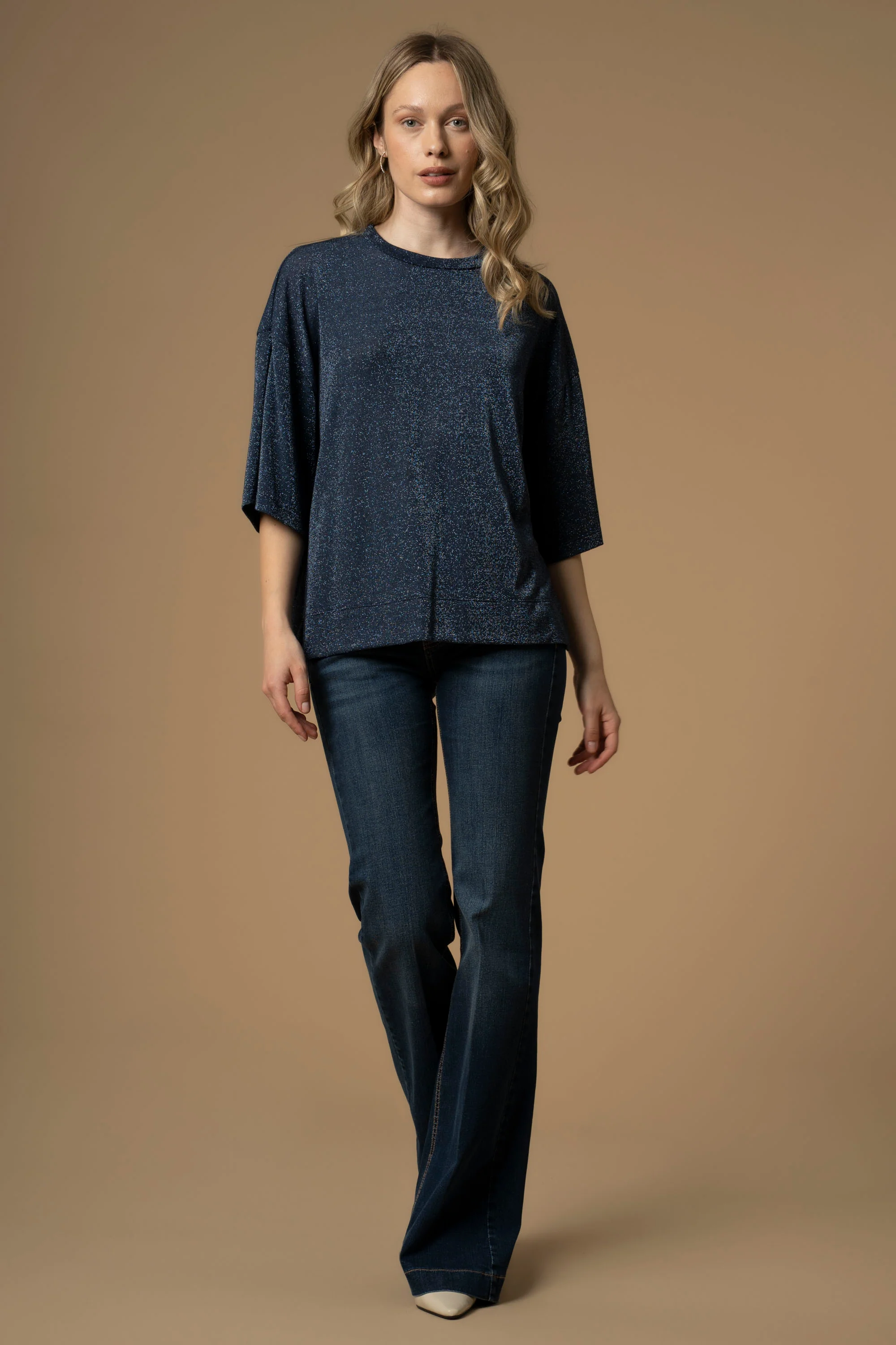 Piacevoli effetti di luce per questa blusa a maniche lunghe in lurex caratterizzata dal giromanica ampio, scollo rotondo e maniche a tre quarti.