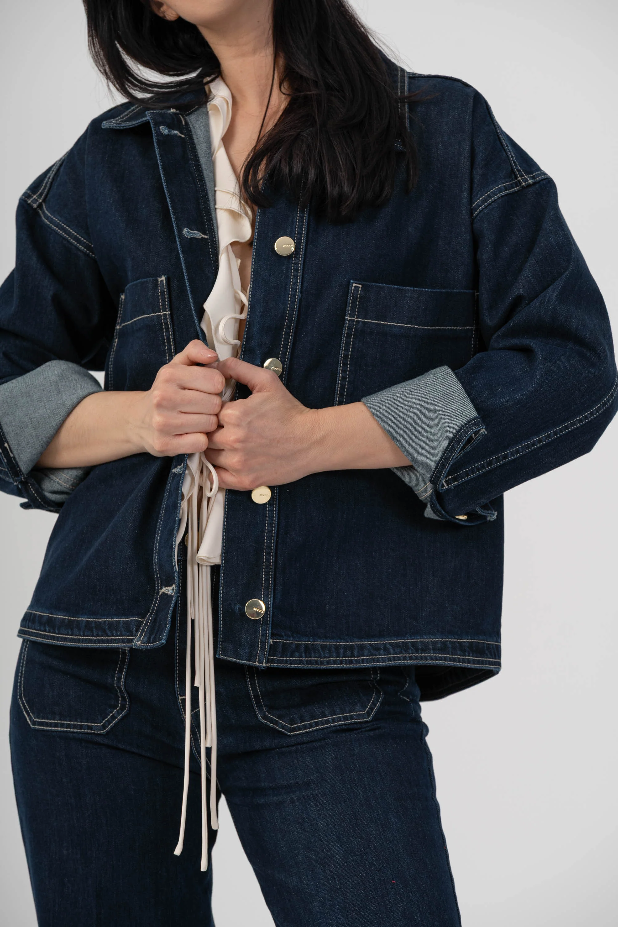 - Giacca in denim scuro dal taglio over contemporaneo con impunture a contrasto che definiscono la silhouette