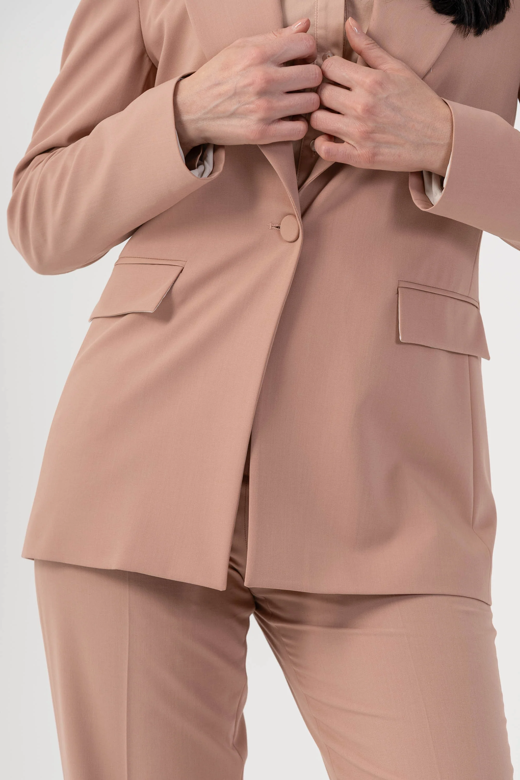 - Design monopetto con ampi revers a lancia e una chiusura frontale con singolo bottone rivestito in tinta